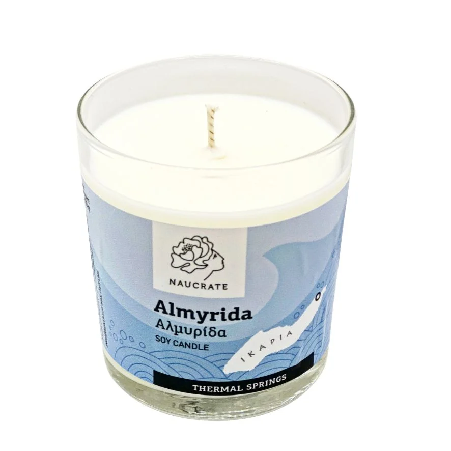 Το κερί σόγιας Almyrida – Αλμυρίδα είναι εμπνευσμένο από τη μοναδική αίσθηση των ιαματικών πηγών της Ικαρίας, εκεί όπου το νερό συναντά τη θάλασσα και δημιουργεί μια εμπειρία καθαρής αναζωογόνησης.
